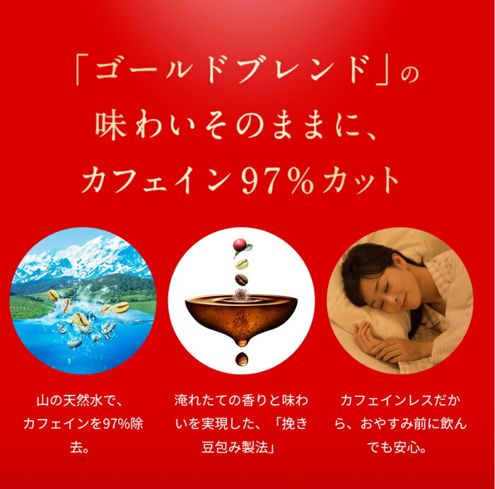 「ゴールドブレンド」ならではの上質な香りとマイルドな味わいはそのままに、 自然の水だけを使用する独自の製法でカフェインを97%カット。