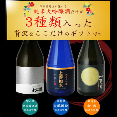 【日本酒 純米大吟醸 飲み比べセット 300ml×3本 内容】 ・加賀ノ月 月光 純米大吟醸 300ml×1本(石川県 加越) ・幻の瀧 純米大吟醸 300ml×1本(富山県 皇国晴酒造) ・上善如水 純米大吟醸 300ml×1本(新潟県 白瀧酒造) ※全て醸造アルコール無添加の純米大吟醸酒になります。